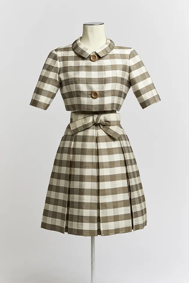 Nina Ricci haute couture, printemps-été 1960, ensemble boléro, robe et ceinture à nœud en cannelé de soie sauvage. Musée Mode & Dentelle © Louis Kerckhof